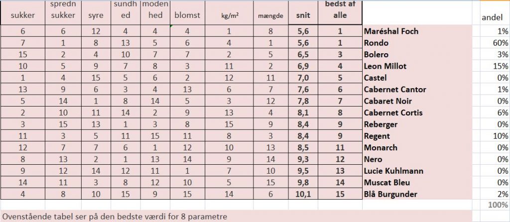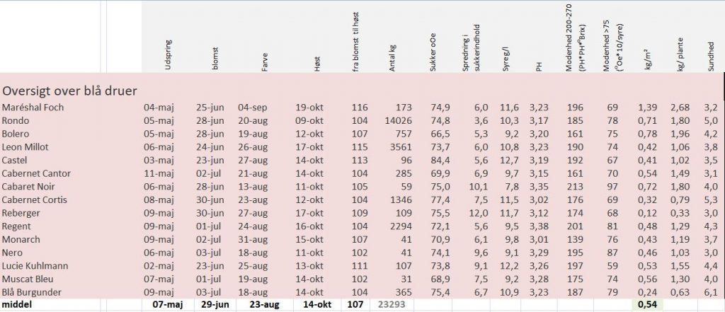 Der findes en række blå druer, som er egnet til vinfremstilling i Danmark. Nedenstående skema viser en sammenligning af en række blå druer på basis af høstrapporterne fra 2017.