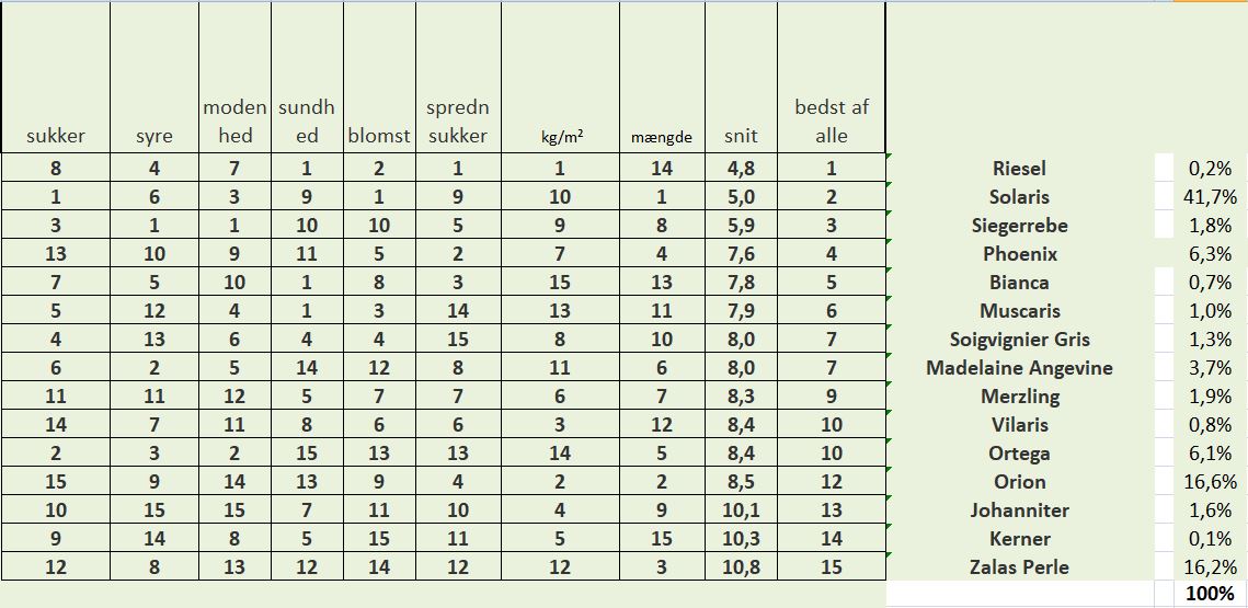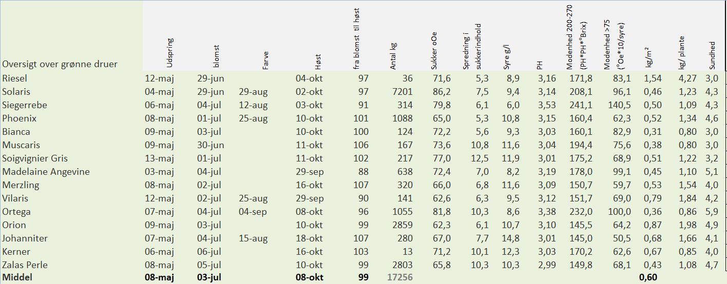 Der findes en række grønne druer, som er egnet til vinfremstilling i Danmark. Nedenstående skema viser en sammenligning af en række blå druer på basis af høstrapporterne fra 2017, rangeret på 8 parametre.