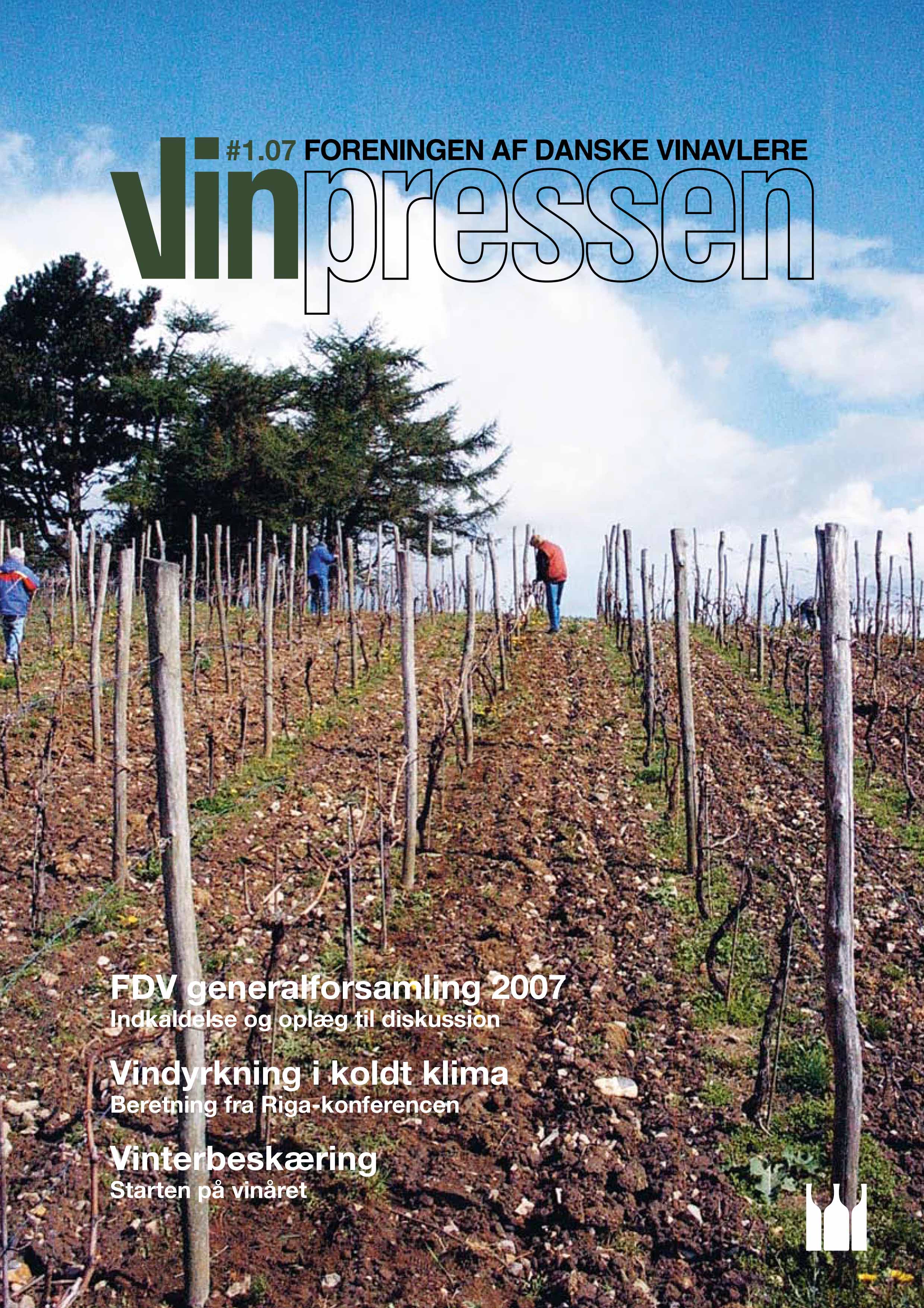 Vinpressen årgang 2007 Klik på det nummer af Vinpressen, som du vil læse. Du skal være logget ind for at læse Vinpressen. LoginVinpressen nr. 1 - 2007 Læs bl.a. om Vinterbeskæringen – starten på vinåret Sprøjteplan Vindyrkning i koldt klima Tyskland – vores nærmeste vinland Lidt om rengøring og hygiejne Vinpressen nr. 2 - 2007 Læs bl.a. om Biodiversitet i vinmarken Riesling & Co Etablering af espalier Indretning af vinproduktion Dansk vin og mad Vinpressen nr. 3 - 2007 Læs bl.a. om Dansk Vinskue 2007 Danske vinbønders brændevinsproduktion er etableret FDV på Kulinarisk Sydfyn Den første ønolog i dansk vin Vinpressen nr. 4 - 2007 Læs bl.a. om På besøg hos medlem nr. 5 Anders Pilgård Udvikling af et dansk vindyrkningsindeks Erfaringer med høje opbindingssystemer Vinpressen 2007 - Særnummer Høstrapport 2006 Læs bl.a. om Klimaet i 2006 Høstrapport, vinåret 2006 Freiburgs nye røde Udvikling af nye druesorter